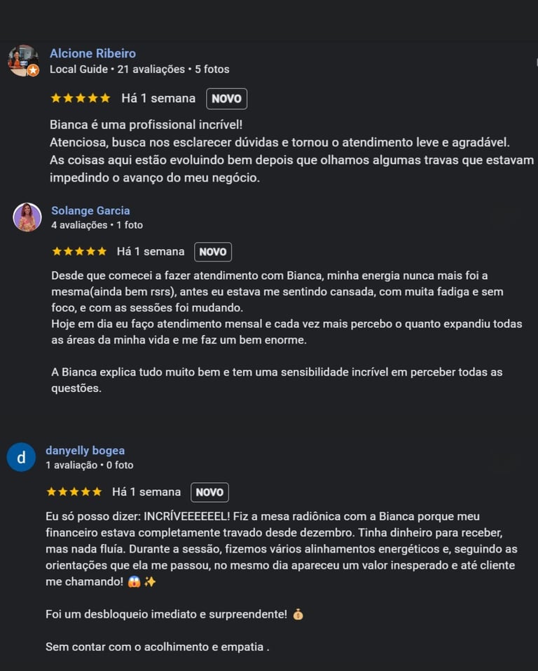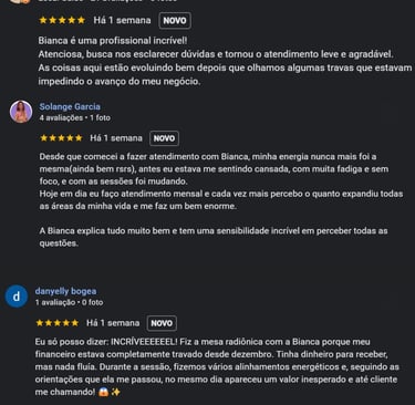Bianca Giovanelli é uma Terapeuta Energética renomada, com anos de experiência e milhares de atendimentos realizados tanto online quanto presencialmente. Como Mestre Reiki, Especialista em Radiestesia e Consteladora Familiar, Bianca dedica sua carreira a ajudar as pessoas a restaurar seu equilíbrio energético e emocional destravando a prosperidade.